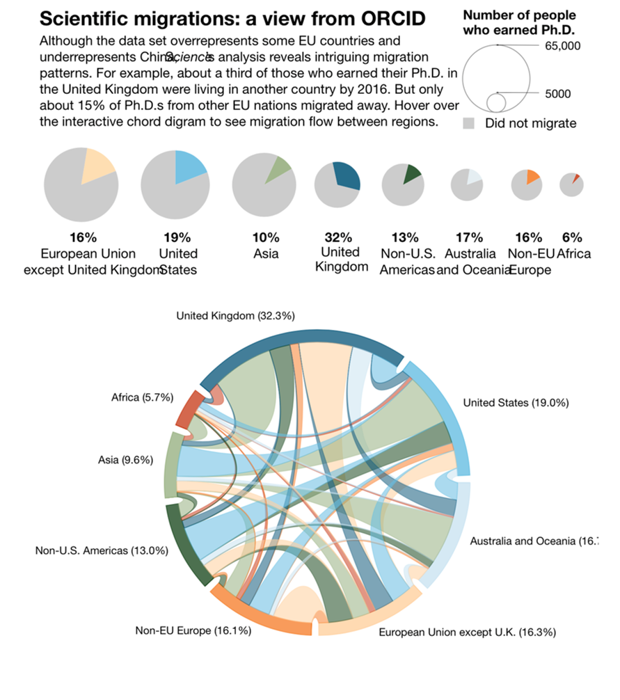 其实科学家国际流动的情况很常见。2017年的5月19号Science出版了一期特刊,叫关于迁移。有一篇讲的是科学家的迁移,其中提到有的科学家甚至十年能搬二十次家。作者追踪到2016年为止,32.2%在英国获得博士学位的人,都离开英国去其他国家发展了。